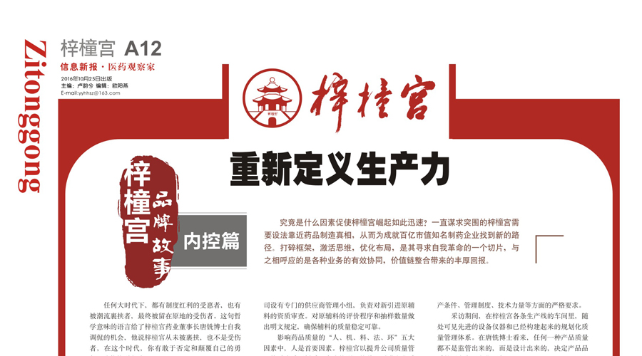 26 16-102016年10月25日,《醫(yī)藥觀察家報》對梓橦宮藥業(yè)品牌故事進行了系列報道。本期報道主題為梓橦宮品牌故事系列之內(nèi)控篇——《梓橦宮:重新定義生產(chǎn)力》。