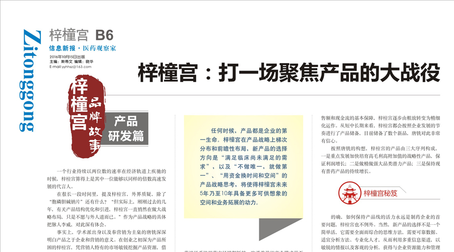17 16-102016年10月15日,《醫(yī)藥觀察家報(bào)》對(duì)梓橦宮藥業(yè)品牌?進(jìn)行了系列報(bào)道。本期報(bào)道主題為梓橦宮品牌系列之產(chǎn)品研發(fā)篇——《梓橦宮:打一場(chǎng)聚焦產(chǎn)品的大戰(zhàn)役》